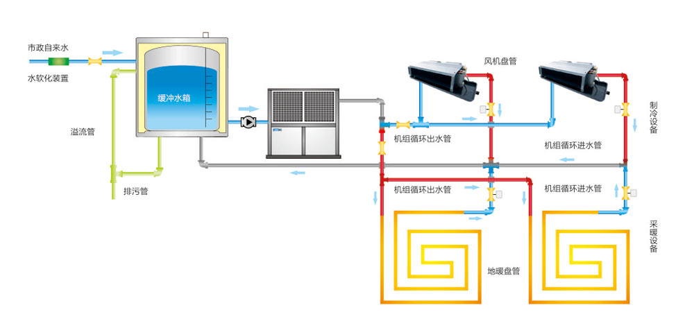 適用于家庭、別墅、學校、政府機關、洗浴中心、度假中心、醫院等場所,當建筑面積比較大時,可在一定規模內使用多臺空氣源熱泵并聯運行解決建筑冷暖負荷。